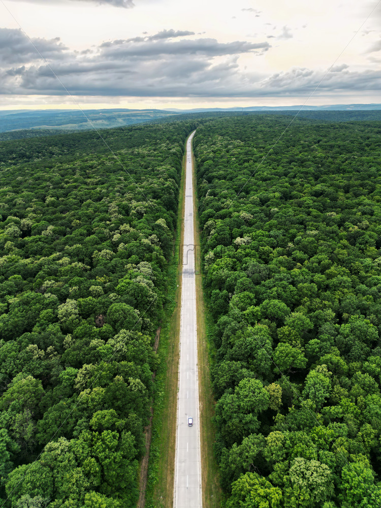 Aerial drone view of nature in Moldova. Road going through a lush wide green forest