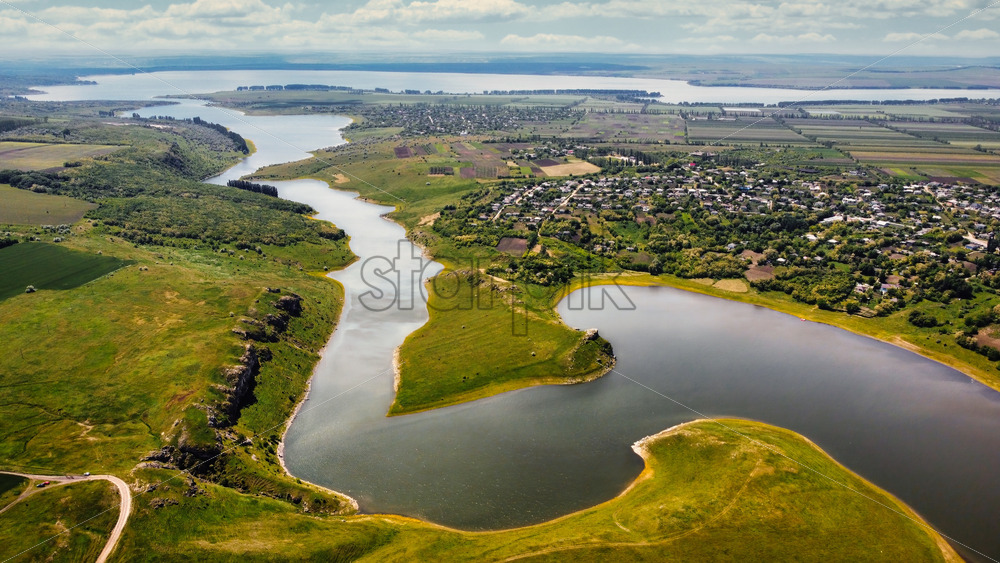 Aerial drone view of nature in Moldova. Village, floating river, fields, greenery