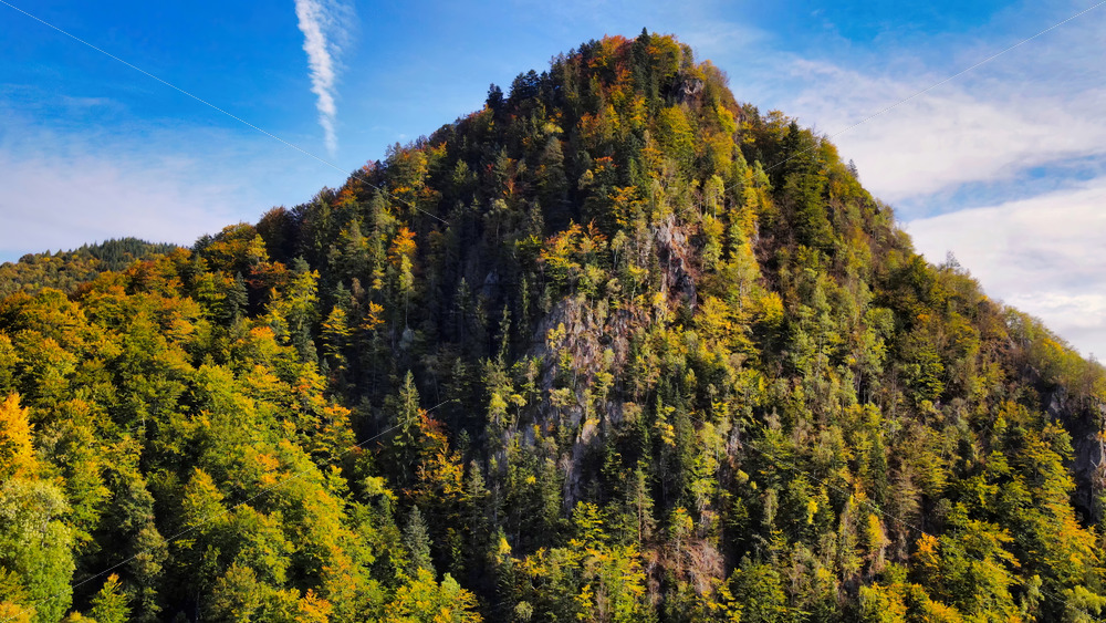 Aerial drone view of nature in Romania. Carpathian mountains, hills covered with lush green forest. Transfagarasan route