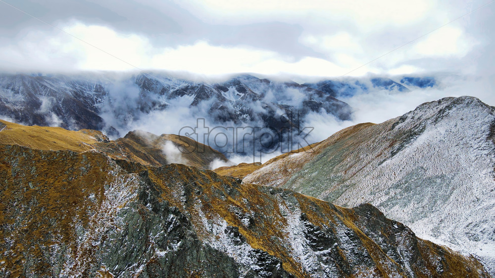 Aerial drone view of nature in Romania. Transfagarasan route in Carpathian mountains, rocky slopes covered with snow, valley and clouds