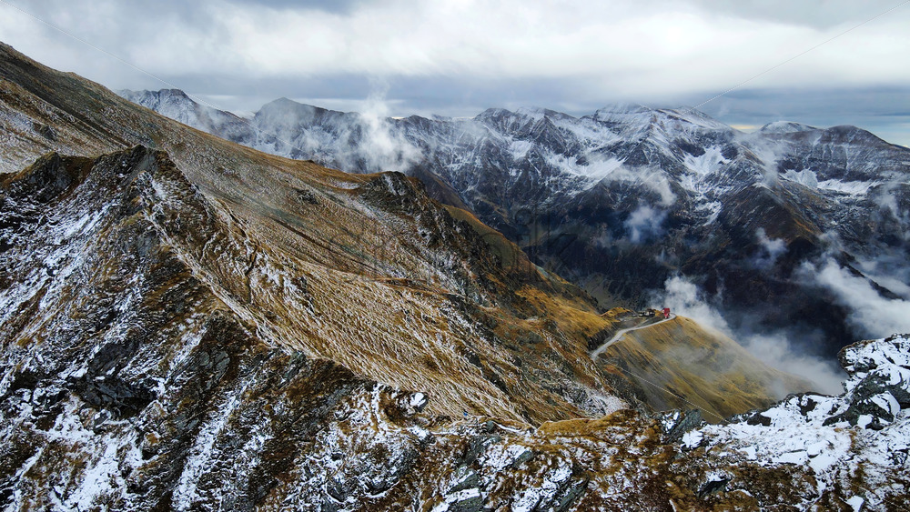Aerial drone view of nature in Romania. Transfagarasan route in Carpathian mountains, rocky slopes covered with snow, valley and clouds