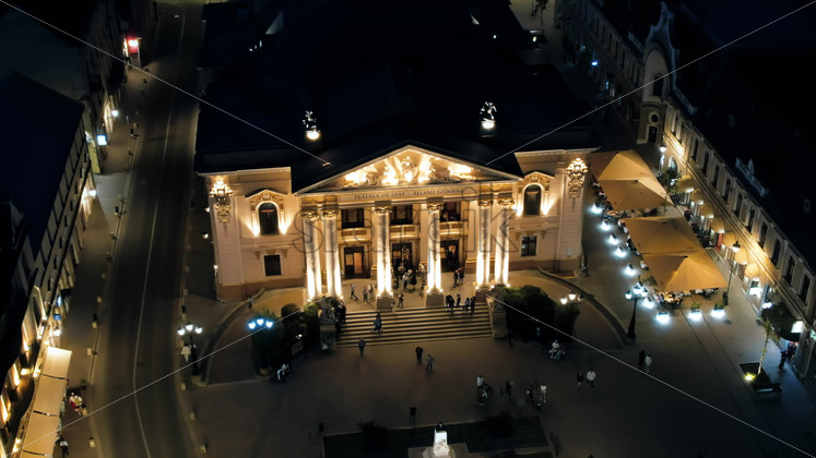 Aerial drone view of Oradea downtown at night, Romania. State Theatre with people coming out, illumination Royalty Free Stock Video Footage