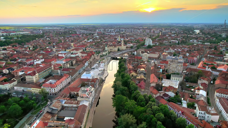 Aerial drone view of Oradea downtown at sunset, Romania. Cityscape with multiple historical buildings made in classic style, Unirii Square, Crisul Repede river Royalty Free Stock Video Footage