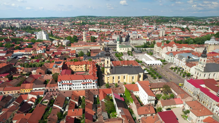 Aerial drone view of Oradea, Romania. View of the city downtown Unirii Square with multiple historical and buildings made in classic style, greenery Royalty Free Stock Video Footage