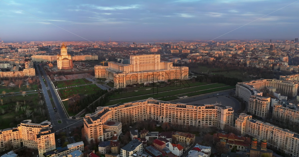 Aerial drone view of Palace of the Parliament in Bucharest downtown at sunset. Romania Royalty Free Stock Video Footage