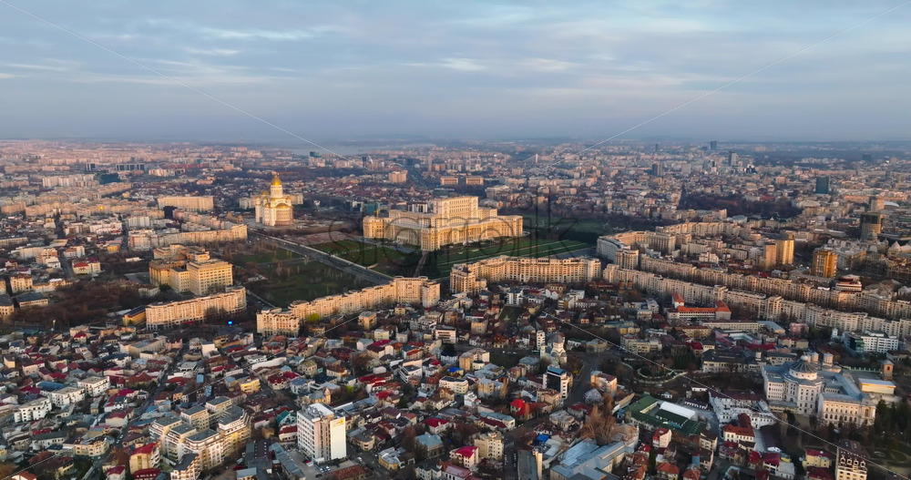 Aerial drone view of Palace of the Parliament in Bucharest downtown at sunset. Romania Royalty Free Stock Video Footage
