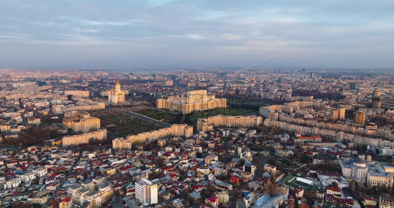Aerial drone view of Palace of the Parliament in Bucharest downtown at sunset. Romania Royalty Free Stock Video Footage