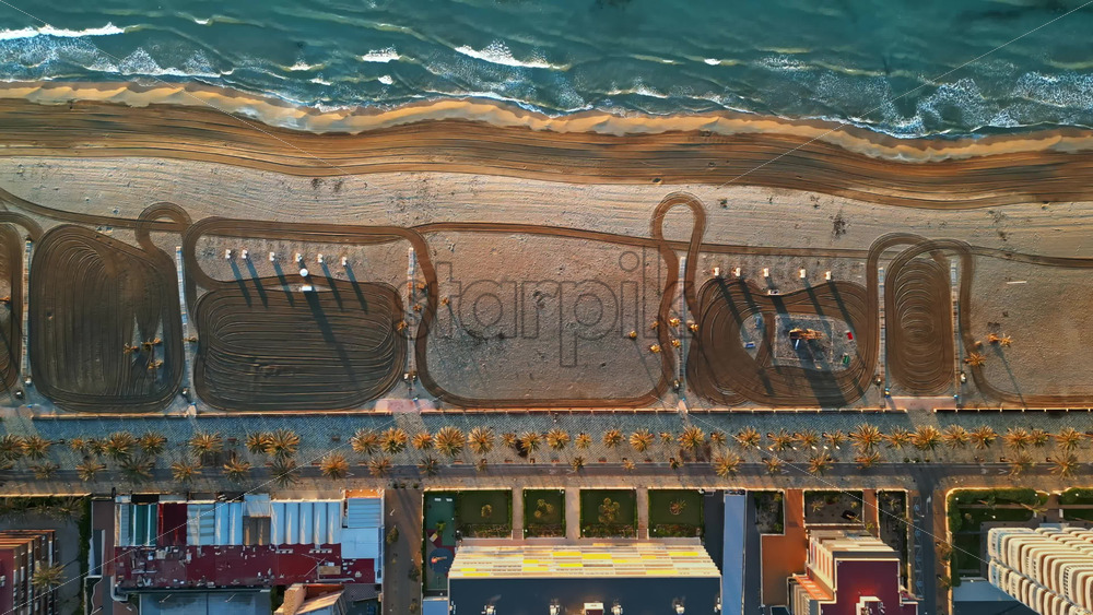 Home » Shop » 1 Video » Video – Aerial drone view of palm trees on a promenade near the beach and buildings along coastline of the city in Alicante, Spain at sunset