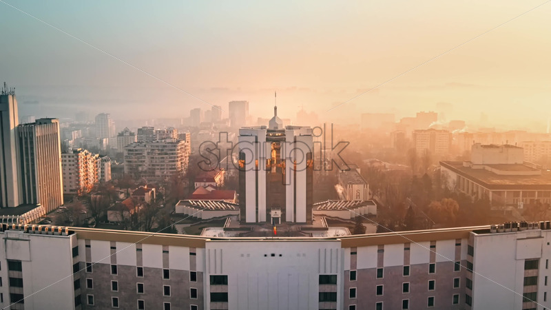 Aerial drone cinematic view of Parliament and Presidency building in Chisinau, Moldova