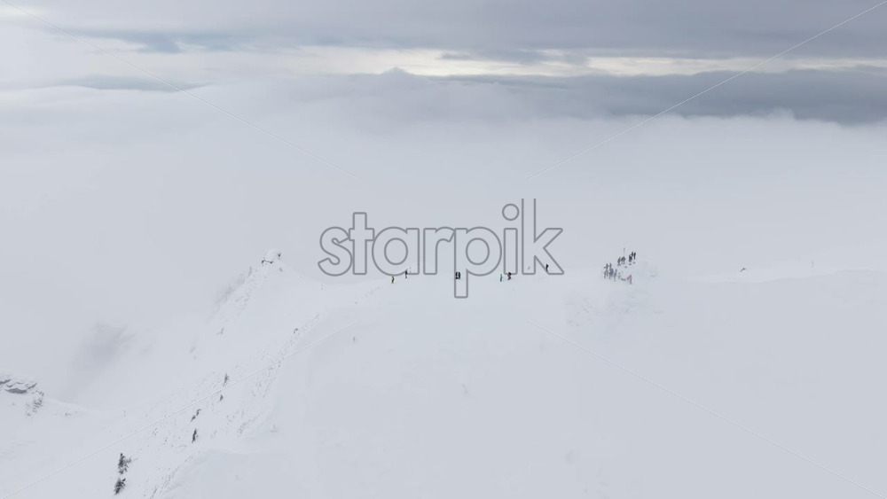 Aerial drone view of people hiking on Ciucas peak covered in snow in winter season. Romania, Carpathian Mountains