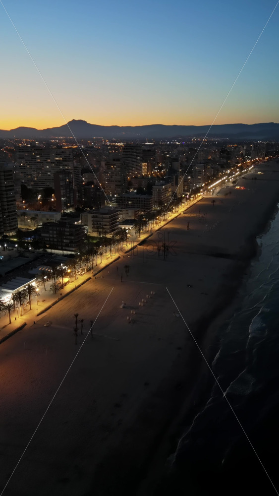 Aerial drone view of palm trees on the beach in Alicante, Spain at sunset. Vertical Royalty Free Stock Video Footage