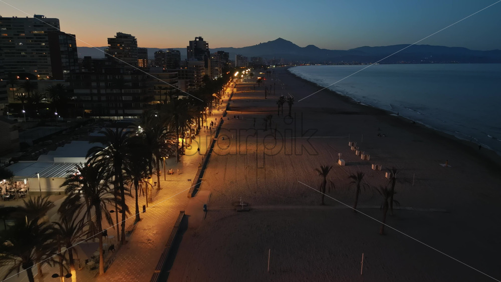 Aerial drone view of people walking on a promenade lined with palm trees near the beach in Alicante, Spain in the evening Royalty Free Stock Video Footage
