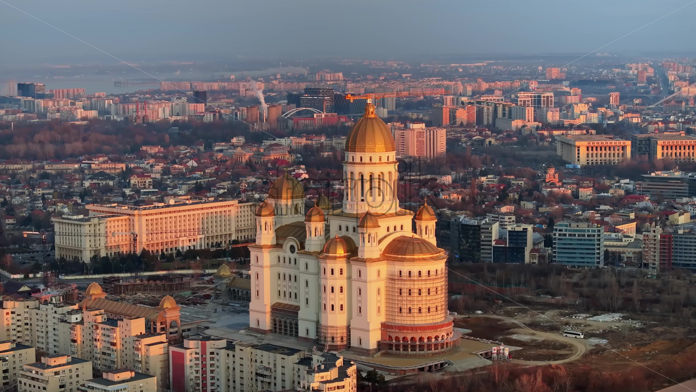 Aerial drone view of People’s Salvation Cathedral near the Palace of the Parliament. Sunset in Bucharest, Romania Royalty Free Stock Video Footage