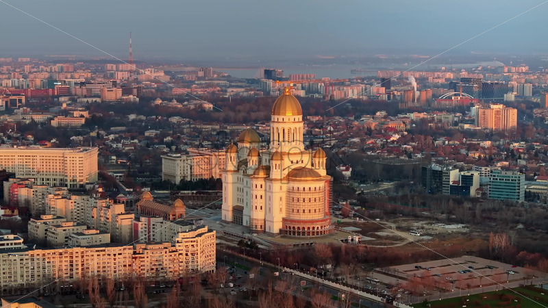 Aerial drone view of People’s Salvation Cathedral near the Palace of the Parliament. Sunset in Bucharest, Romania Royalty Free Stock Video Footage