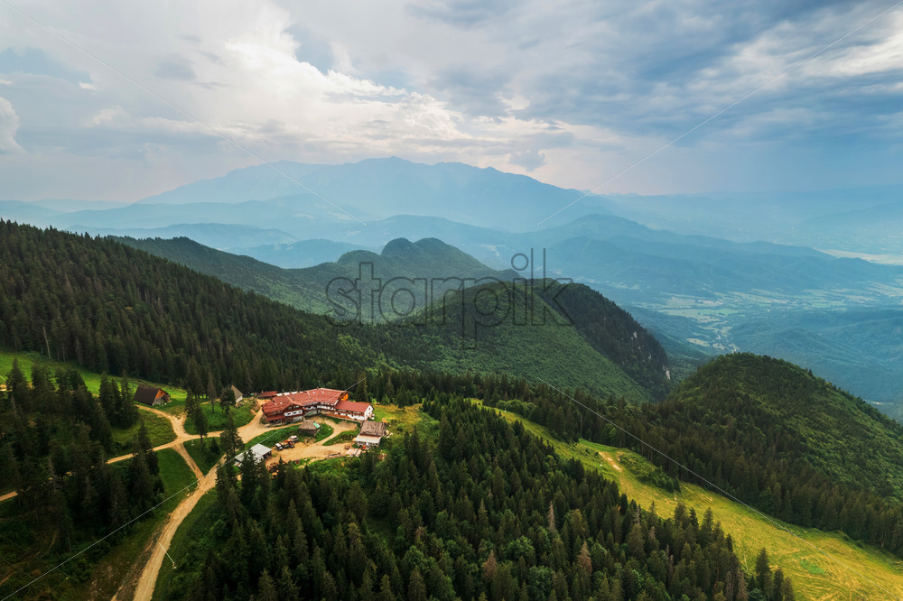 Aerial drone view of Poiana Brasov, Romania. Touristic buildings located on top of the mountain covered with lush forest