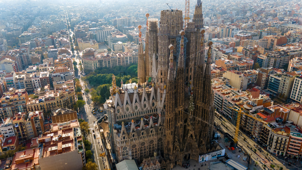 Aerial drone view of Sagrada Familia in Barcelona, Spain. Blocks with multiple buildings and greenery around it