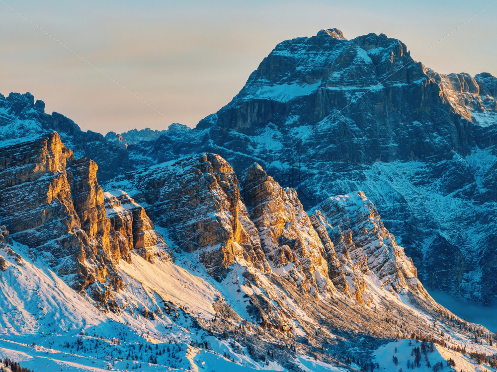 Aerial drone view of snow on the mountains in the Dolomites, Italy