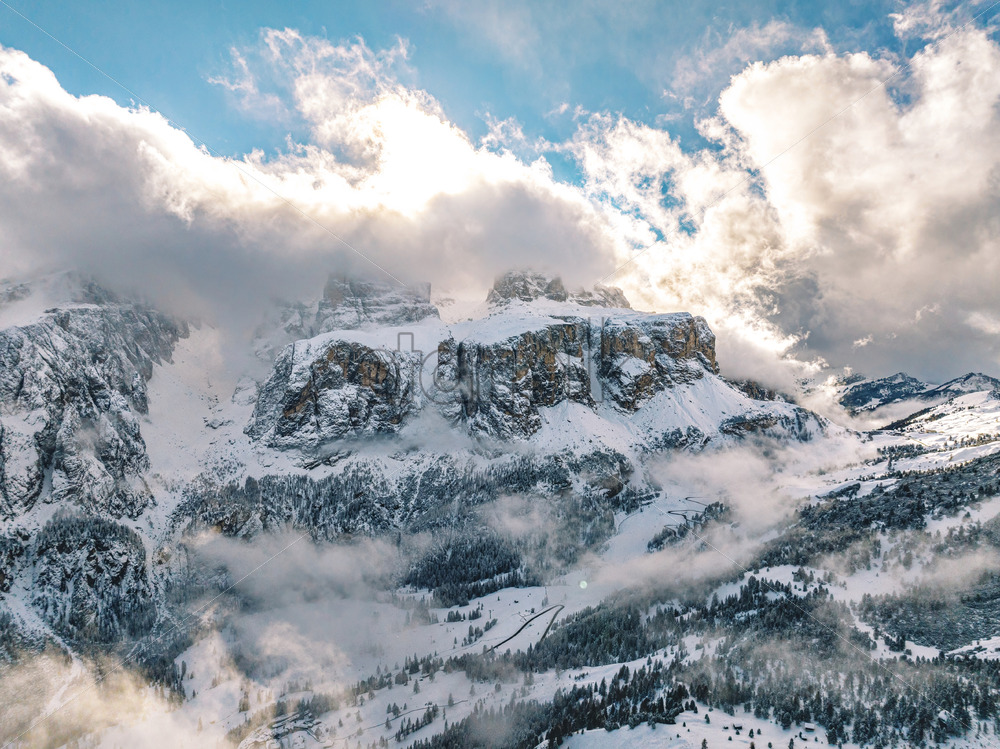 Aerial drone view of snow on the mountains in the Dolomites, Italy