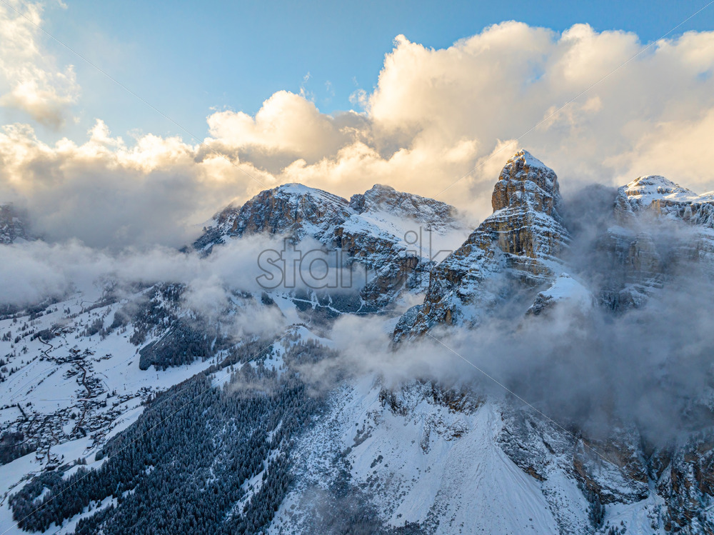 Aerial drone view of snow on the mountains in the Dolomites, Italy