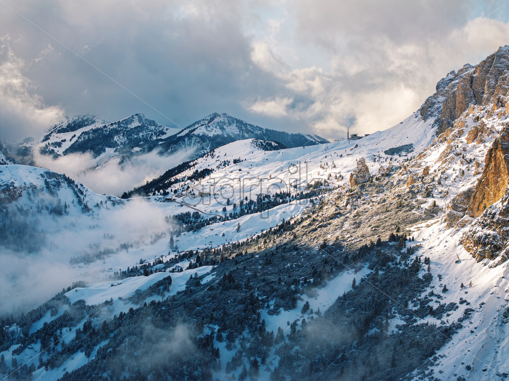 Aerial drone view of snow on the mountains in the Dolomites, Italy