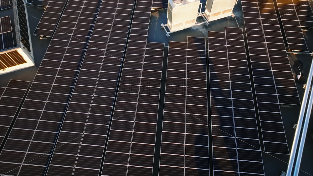 Video – Aerial drone view of solar panels at sunset. Photovoltaics on top of the roof of the building. Alternative electricity source. Concept of sustainable resources