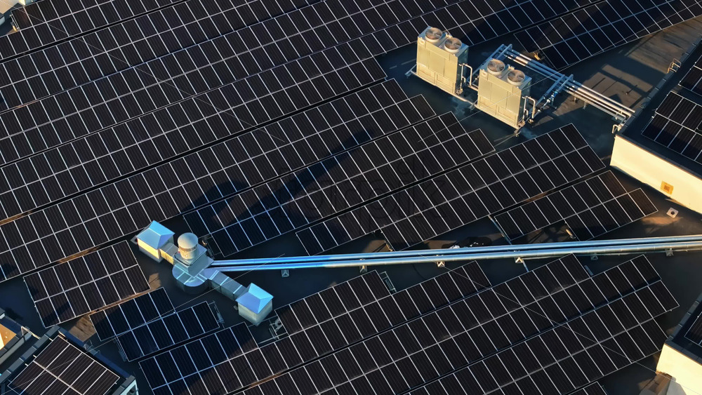 Video – Aerial drone view of solar panels at sunset. Photovoltaics on top of the roof of the building. Alternative electricity source. Concept of sustainable resources
