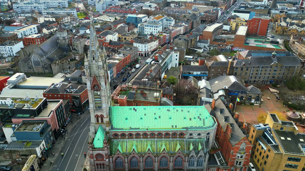Aerial drone view of St. Mary’s Church in Dublin’s city center with surrounding historic and modern buildings Royalty Free Stock Video Footage