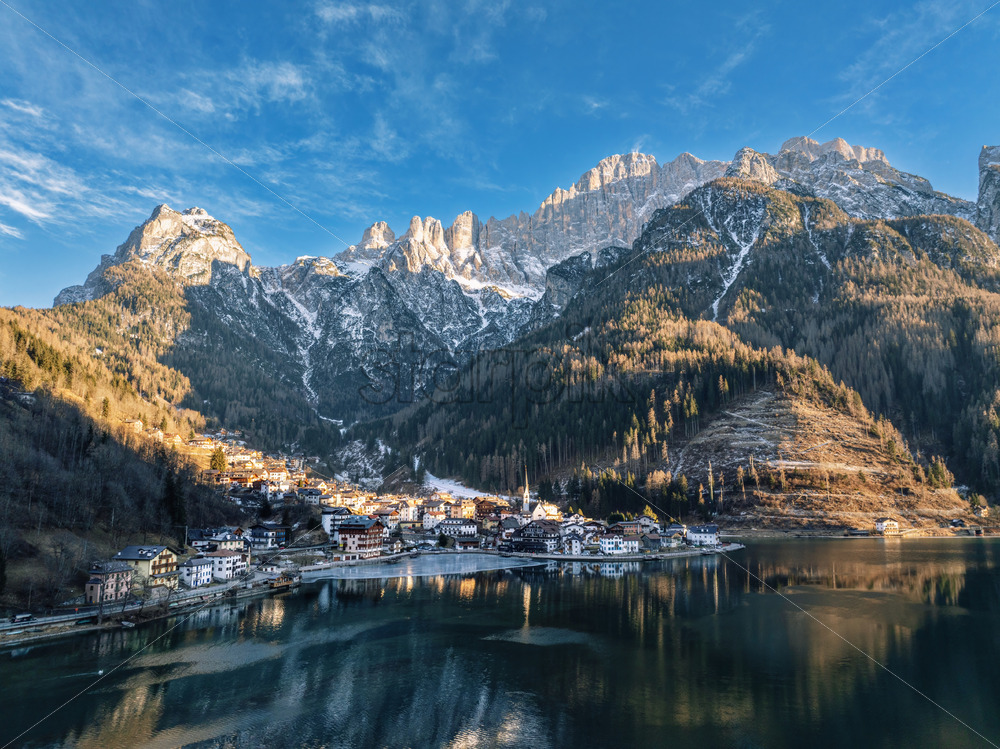 Aerial drone view of the Alleghe village with Lake Alleghe, in the province of Belluno, Dolomites, Italy