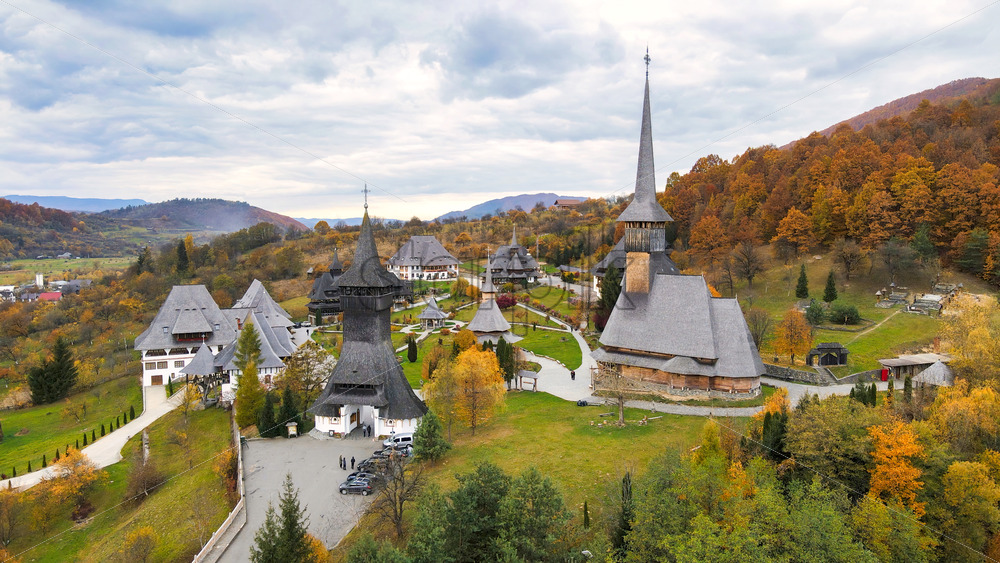 Aerial drone view of the Barsana Monastery, Romania. Main church and other buildings, visitors, hills covered with yellowing forest around