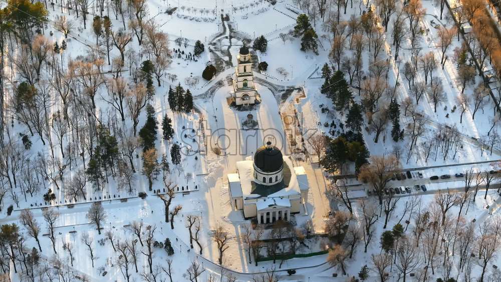 Aerial drone top view of the Bell tower and the Metropolitan Cathedral of Christ’s Nativity. City center covered in snow at sunset in Chisinau, Moldova Royalty Free Stock Video Footage