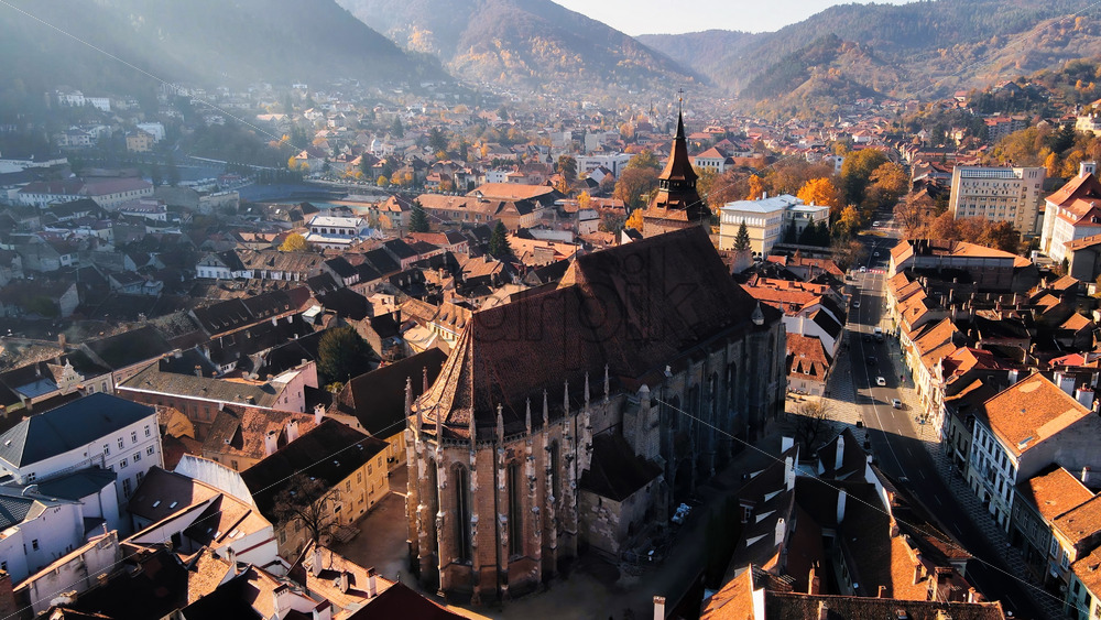 Aerial drone view of The Black Church in Brasov, Romania. Old city centre with buildings and yellowed trees