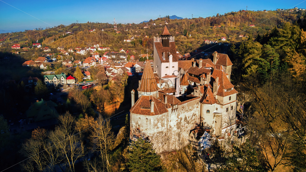 Aerial drone view of The Bran Castle in Romania. Medieval castle in Carpathians, yellowed trees, village