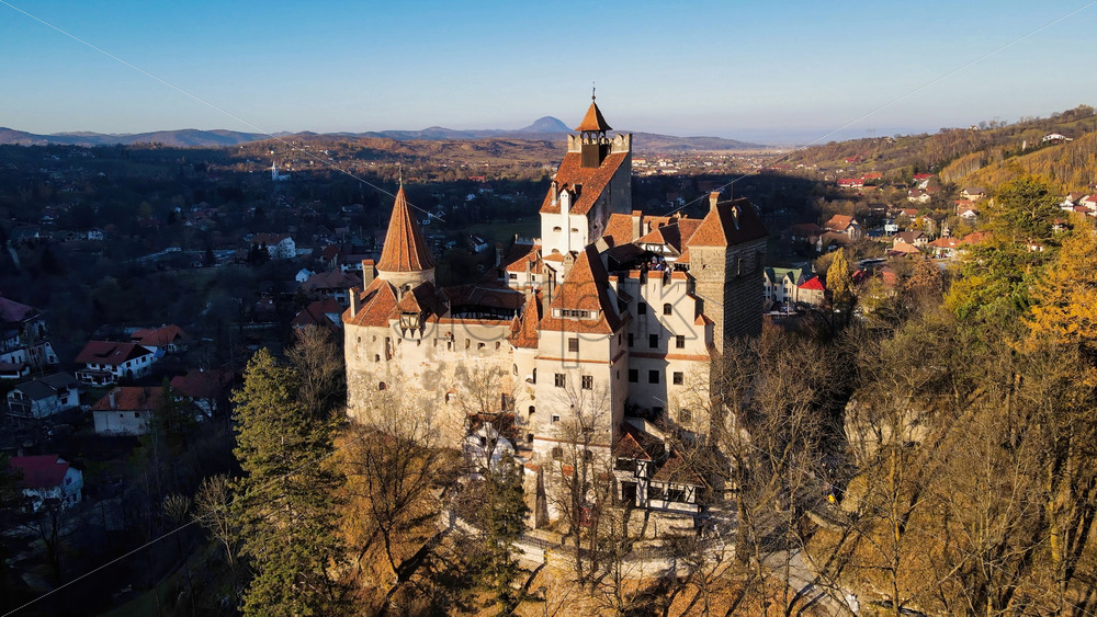 Aerial drone view of The Bran Castle in Romania. Medieval castle in Carpathians, yellowed trees, village