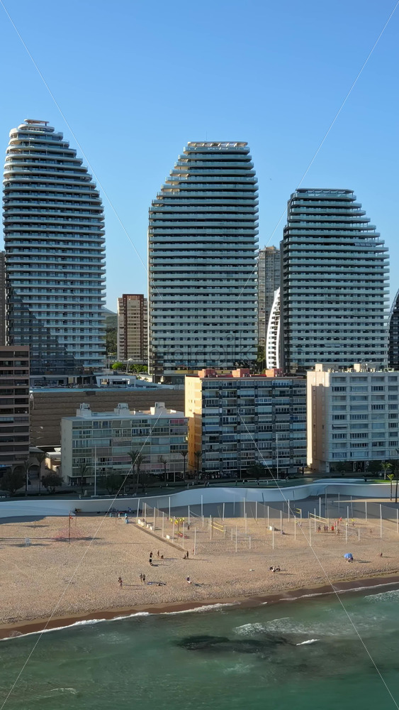 Aerial drone view of the buildings along the coastline and the sea in Benidorm, Spain in daylight. Vertical Royalty Free Stock Video Footage