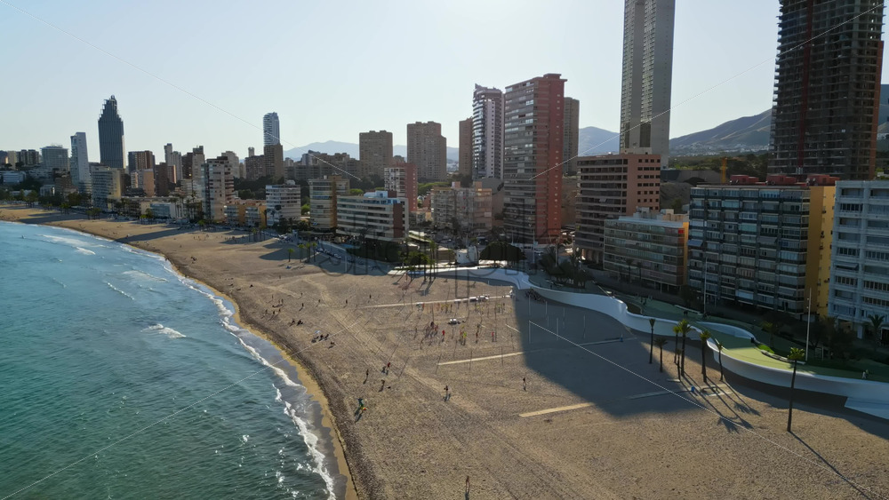 Home » Shop » 1 Video » Video – Aerial drone view of the buildings along the coastline with people relaxing on the beach in Benidorm, Spain in daylight