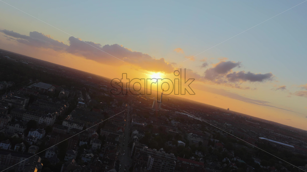 Copenhagen, Denmark – August 3, 2025: Aerial drone view of a beautiful street in the city at dusk, with colourful clouds and the sun setting behind historic buildings Royalty Free Stock Video Footage
