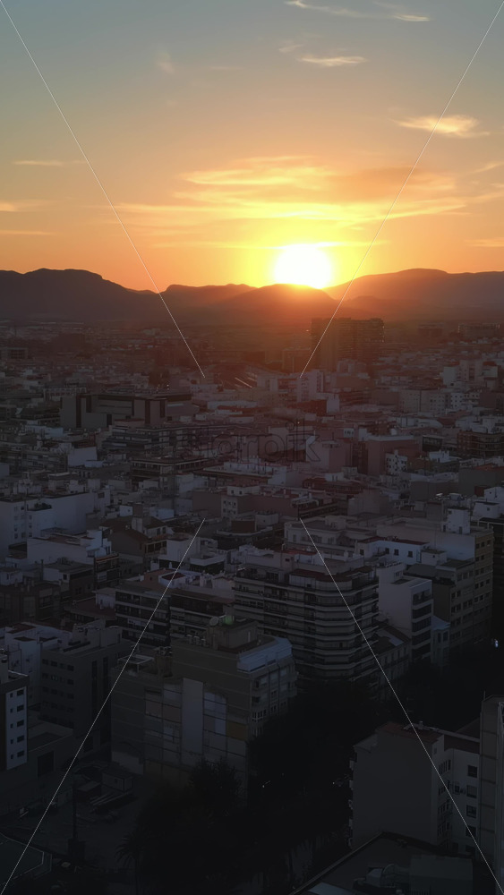 Aerial drone view of the sea and the Alicante city in Spain at sunset. Vertical Royalty Free Stock Video Footage
