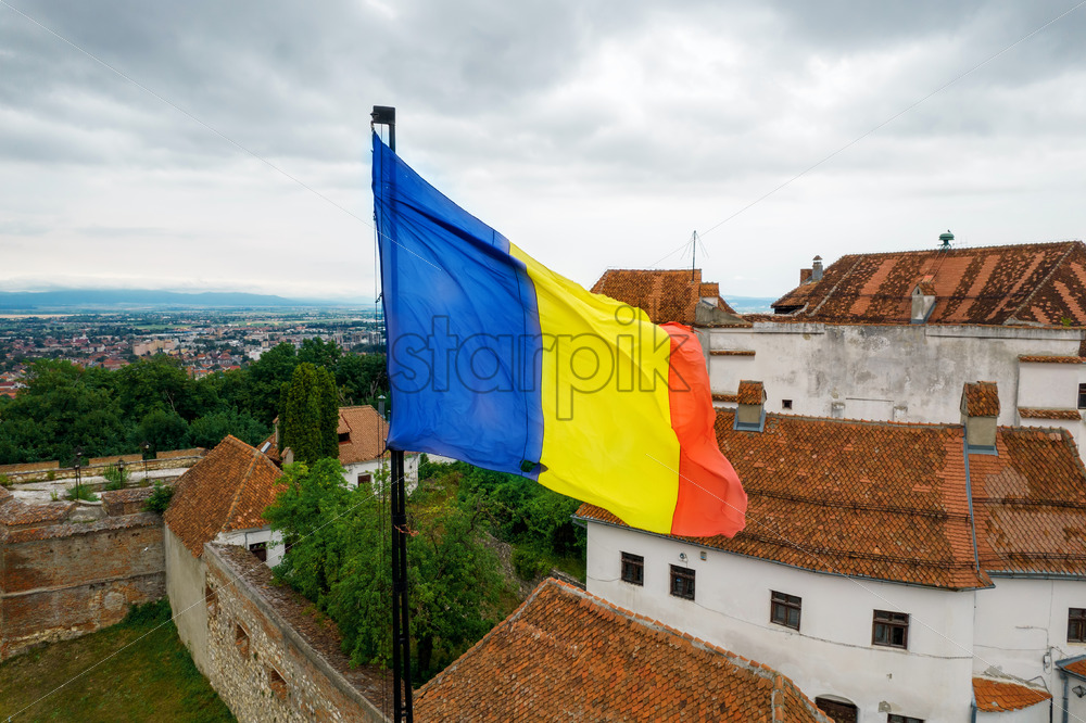 Aerial drone view of The Citadel in Brasov, Romania. Medieval fortress with national flag on the top of a hill. Buildings and green trees around