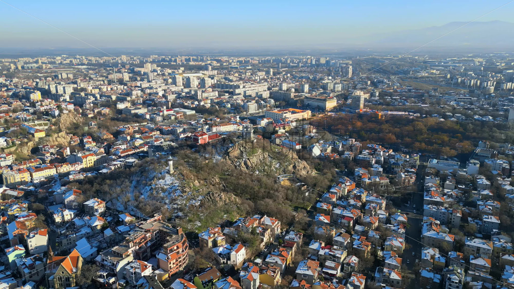 Aerial drone view of the ancient Theatre of Philippopolis. Orange roofs covered in snow. The city center of Plovdiv, Bulgaria Royalty Free Stock Video Footage