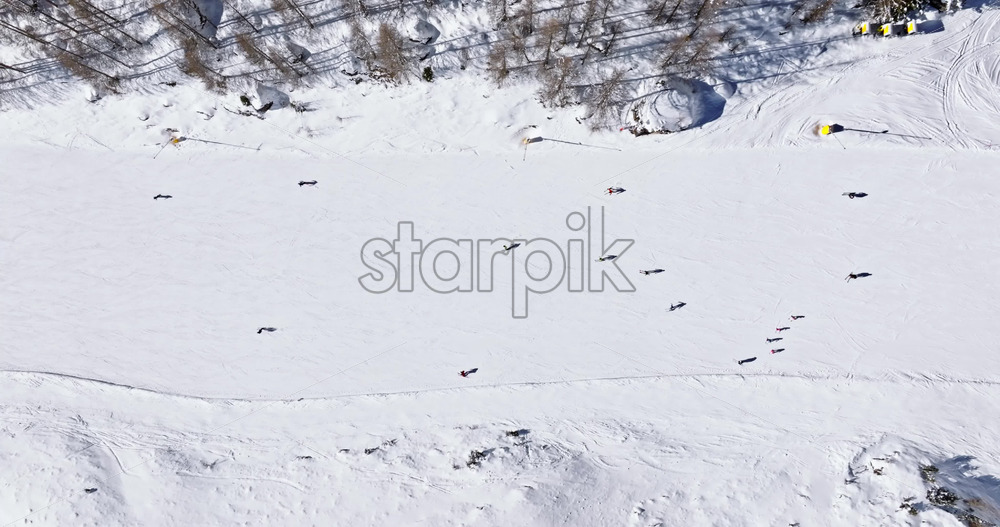 Aerial drone view of people skiing in Colfosco in South Tyrol, Dolomites, Northern Italy Royalty Free Stock Video Footage
