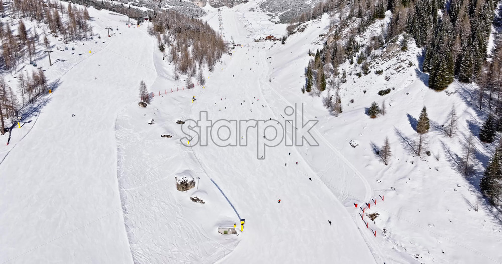 Colfosco, Italy – January 11, 2025: Aerial drone view of people skiing in Colfosco in South Tyrol, Dolomites, Northern Italy Royalty Free Stock Video Footage