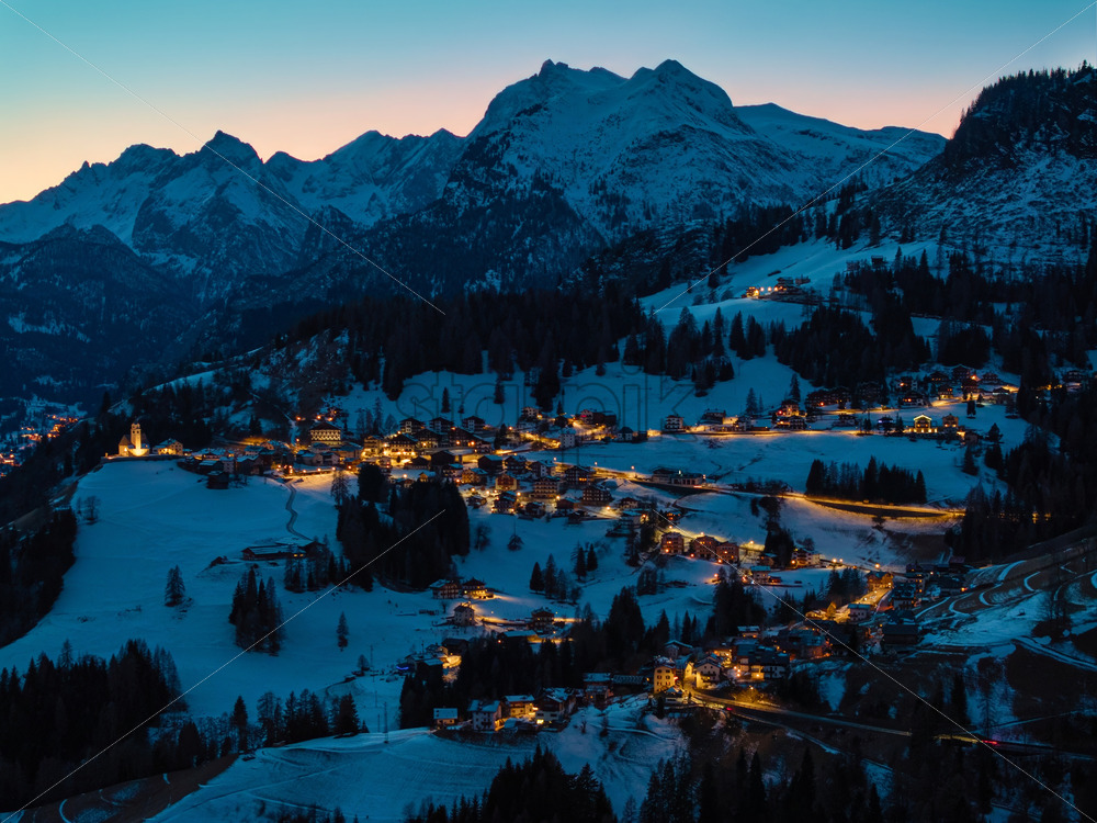 Aerial drone view of the Colle Santa Lucia commune in the Province of Belluno, Dolomites, Italy, illuminated in the evening