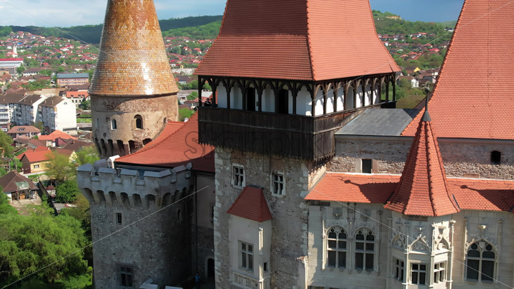Aerial drone view of the Corvin Castle facade located in Hunedoara, Romania. Greenery and buildings around Royalty Free Stock Video Footage