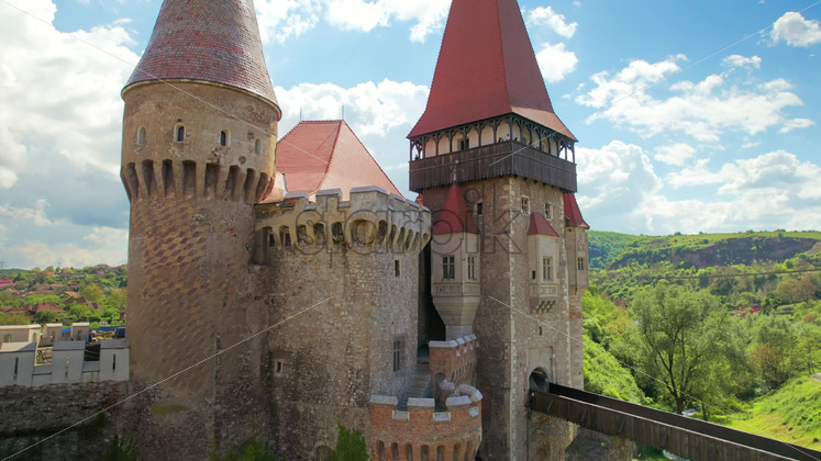 Aerial drone view of the Corvin Castle located in Hunedoara, Romania. Bridge leading to the entrance. Greenery and buildings around Royalty Free Stock Video Footage