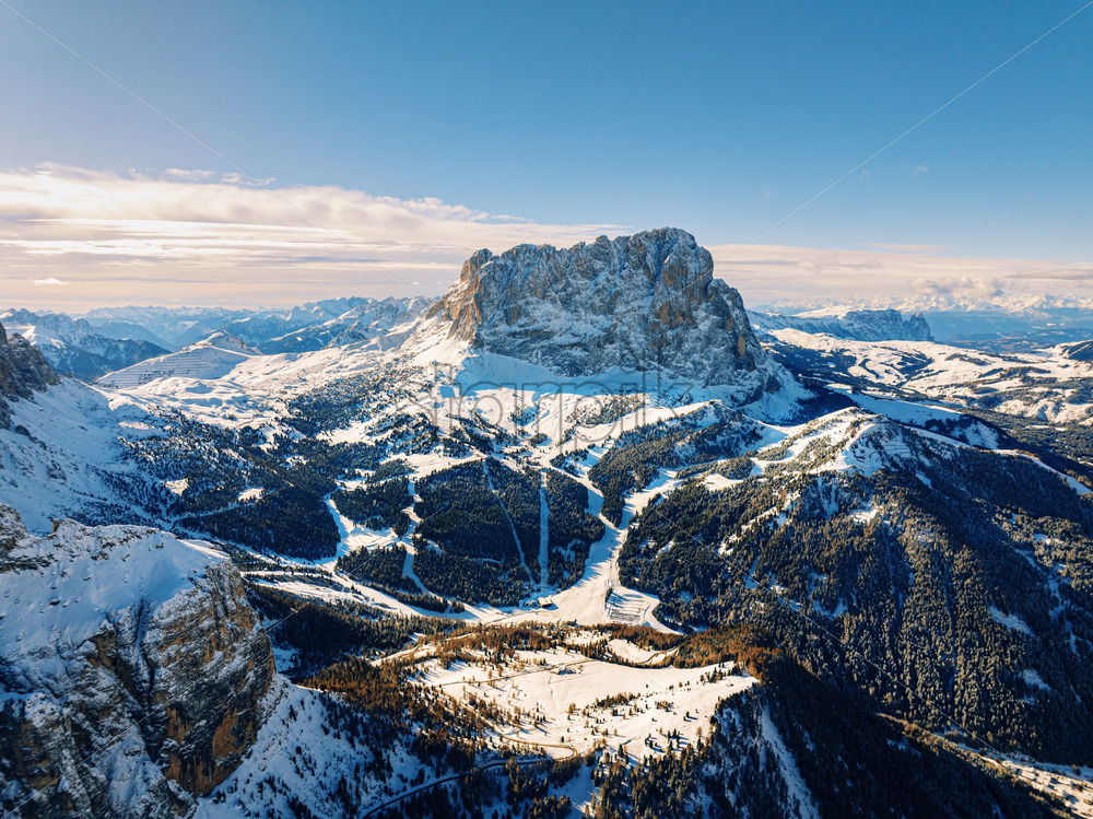 Aerial drone view of the Gardena Pass high mountain pass in the Dolomites, Italy