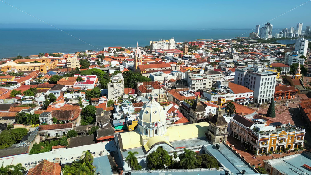 Aerial drone view of the historic center of Cartagena, Colombia alongside the Caribbean coast and promenade in daylight Royalty Free Stock Video Footage