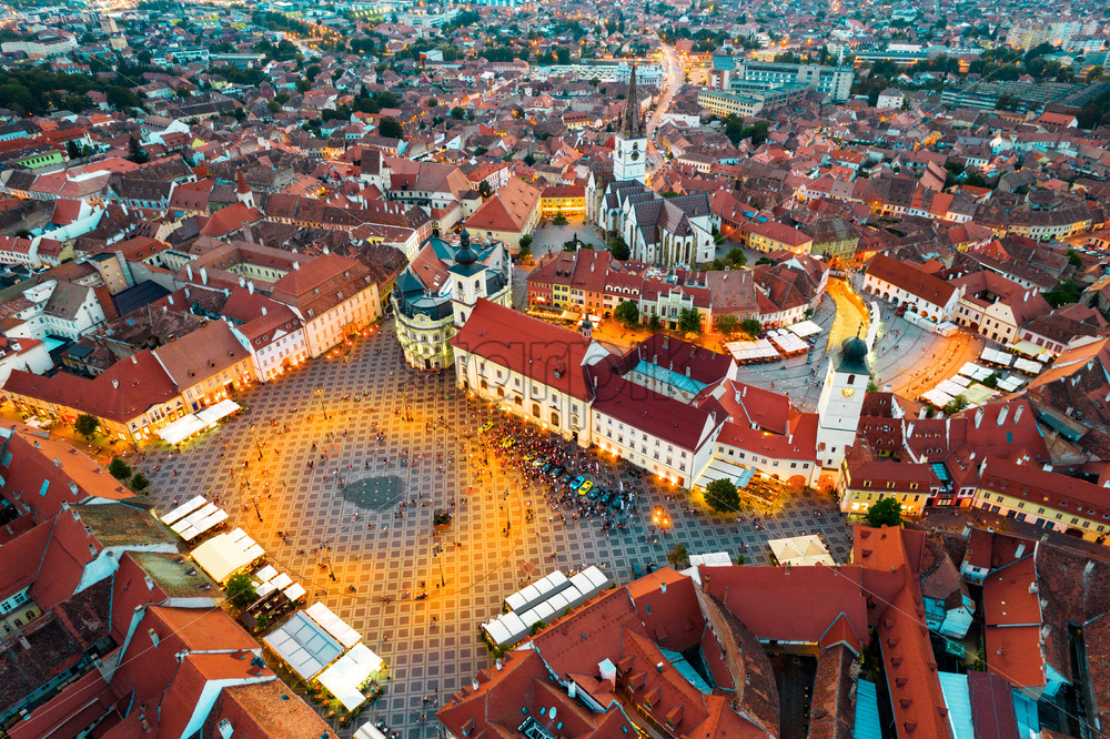 Home » Shop » photo » Aerial drone view of the Historic Centre of Sibiu at evening, Romania. The Great Square with Sibiu Lutheran Cathedral and old buildings around, narrow streets, people, illumination