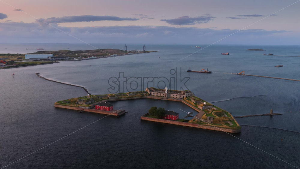 Aerial drone view of the historic Trekroner Fort with its lighthouse and old military buildings by the sea in Copenhagen, Denmark Royalty Free Stock Video Footage