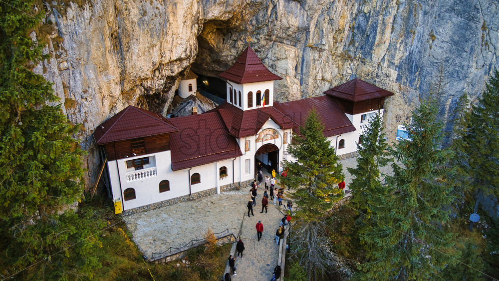 Aerial drone view of The Ialomitei Cave in Romania. Entrance into the cave with tourists in Bucegi Mountains