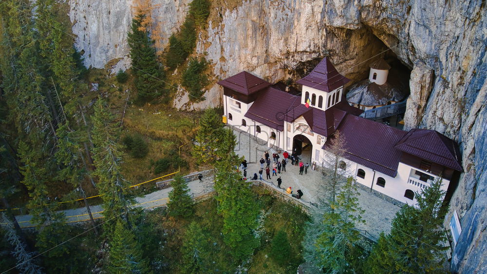 Aerial drone view of The Ialomitei Cave in Romania. Entrance into the cave with tourists in Bucegi Mountains